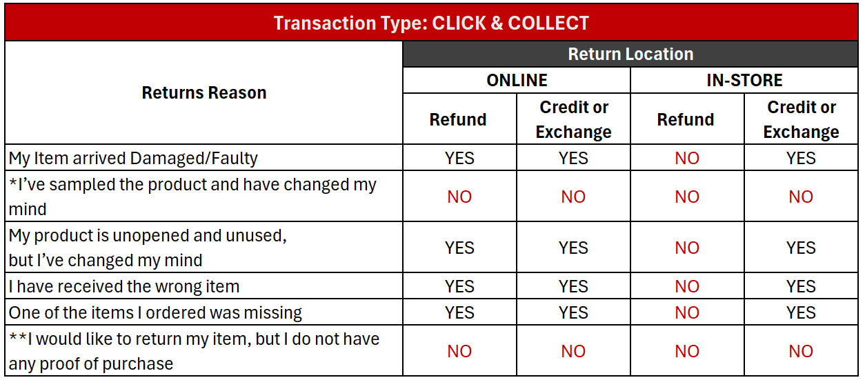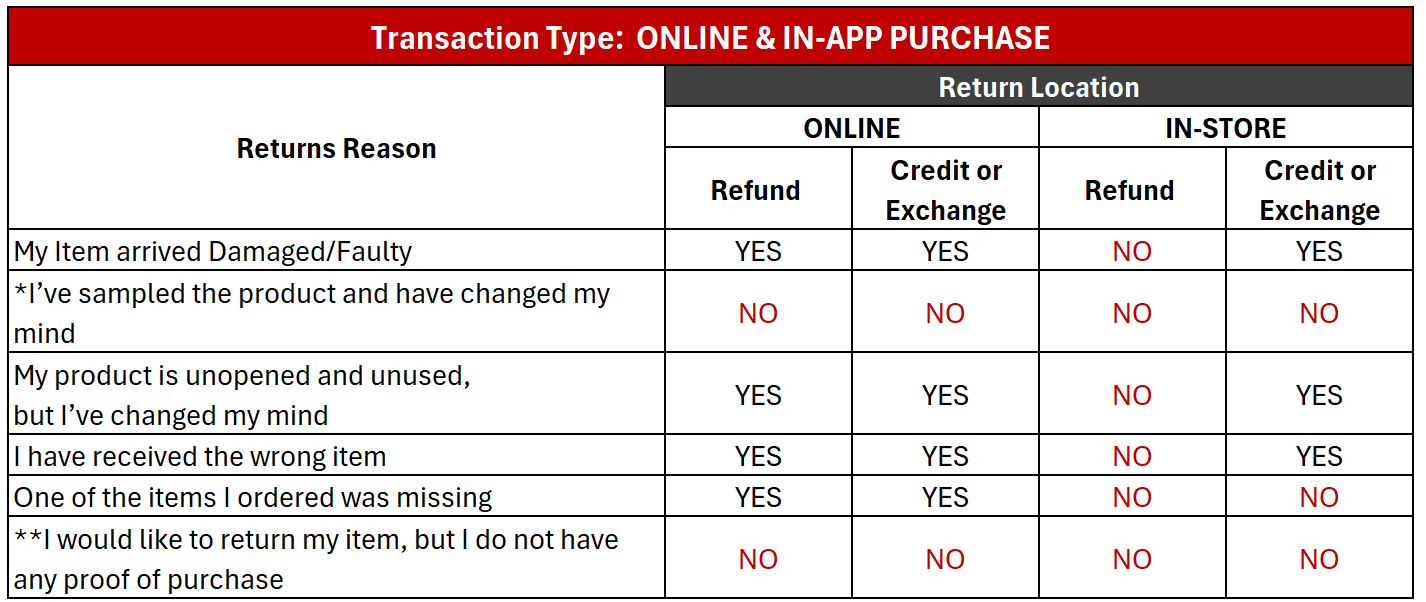 Online purchases may be exchanged in-store for another product or a gift card, or returned via the online return process for a refund in accordance with your original payment method. This applies to change-of-mind returns only and does not affect your ACL rights for faulty goods.